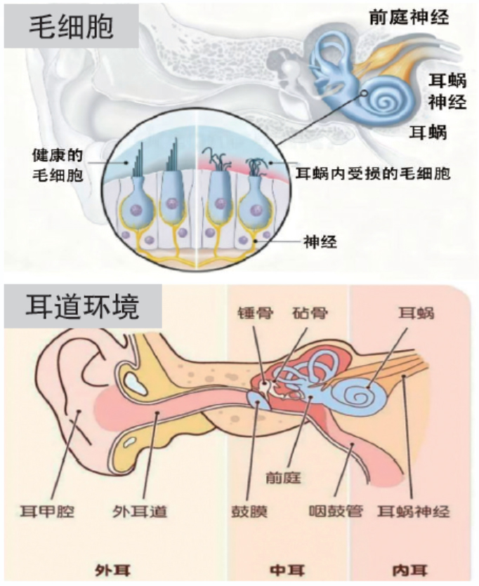 1.怕“吵”的听觉细胞(毛细胞):在我们耳蜗深处,居住着数以千计的听觉细胞,学名叫毛细胞,它们负责将声音的振动转化为大脑能理解的神经信号,然而这些听觉细胞非常脆弱。长时间的高强度噪声(例如超过85分贝,大约相当于繁忙城市交通的噪音)会使毛细胞受损,甚至死亡。目前,毛细胞一旦死亡,临床中暂无使其恢复再生的有效办法。毛细胞早期损伤可能仅表现为偶尔的耳鸣或耳闷,极易被忽视,等到患者发现需要别人重复说话、听不清高频声音时,往往为时已晚。