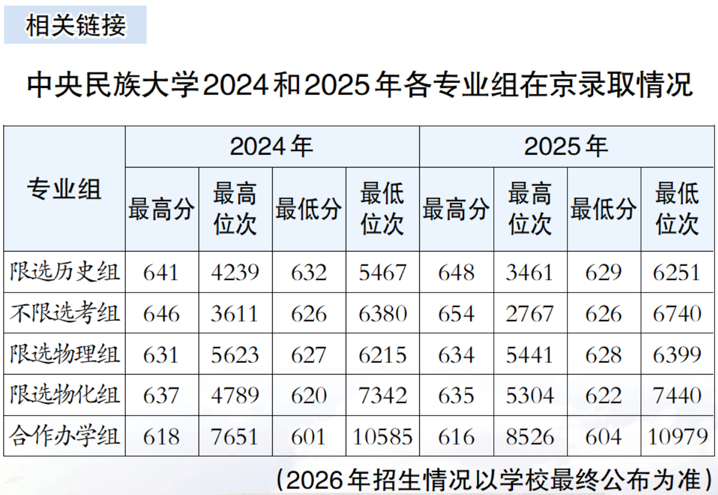 中央民族大学招生就业工作处副处长孙洋介绍,学校近几年在京招生计划、实际录取人数逐年上升。学校普通类招生专业在京分5个组进行招生,分别是限选历史组、不限选考组、限选物理组、限选物化组以及合作办学组(限选物化),各组录取分数及位次近年保持相对稳定。近几年,学校计算机类、电子信息类、法学类、汉语言文学、历史学、民族学专业报考人数较多。