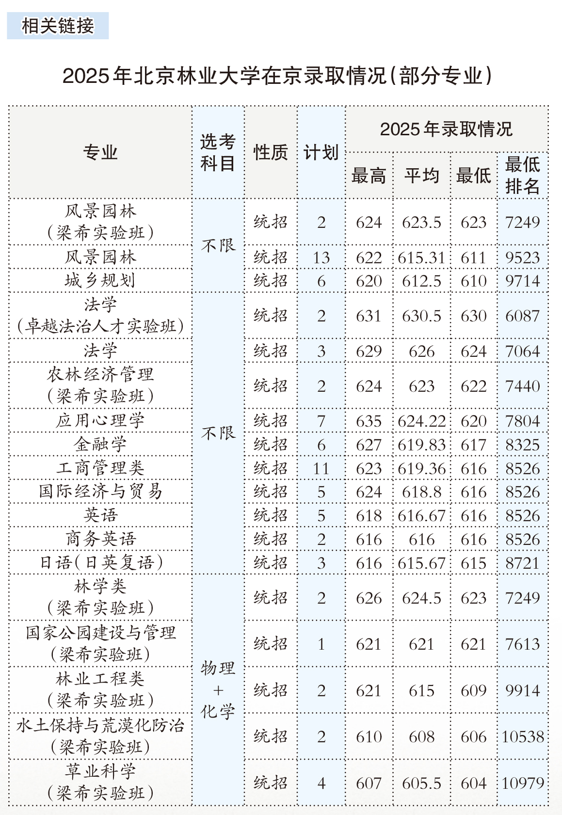 北京林业大学招办主任刘芳表示,学校近几年在京招生计划均有所增加。从报考热度上看,生物科学(拔尖班)、风景园林(梁希实验班)、林学类(梁希实验班)、法学(卓越法治人才实验班)、计算机类等专业报考热度较高,前四个人才培养实验班在京录取的最低位次在6000至7000名左右,计算机类录取最低位次在10000名左右。