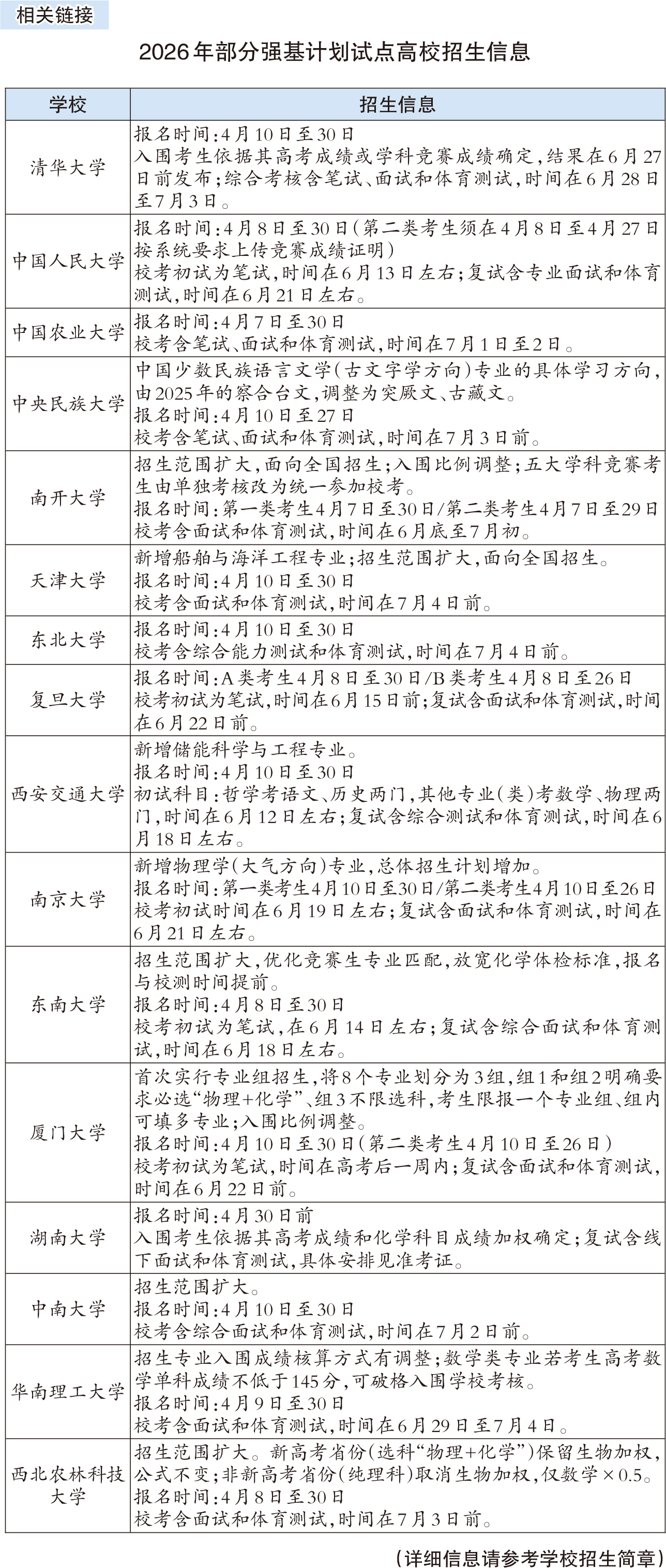 各高校近日陆续发布强基计划招生简章,网上报名大多于本月底结束。多校明确今年新增专业及选拔机制调整等政策变化,考生要了解自身是否适合报考强基计划以及学校招录流程等相关要求,做好报考准备。