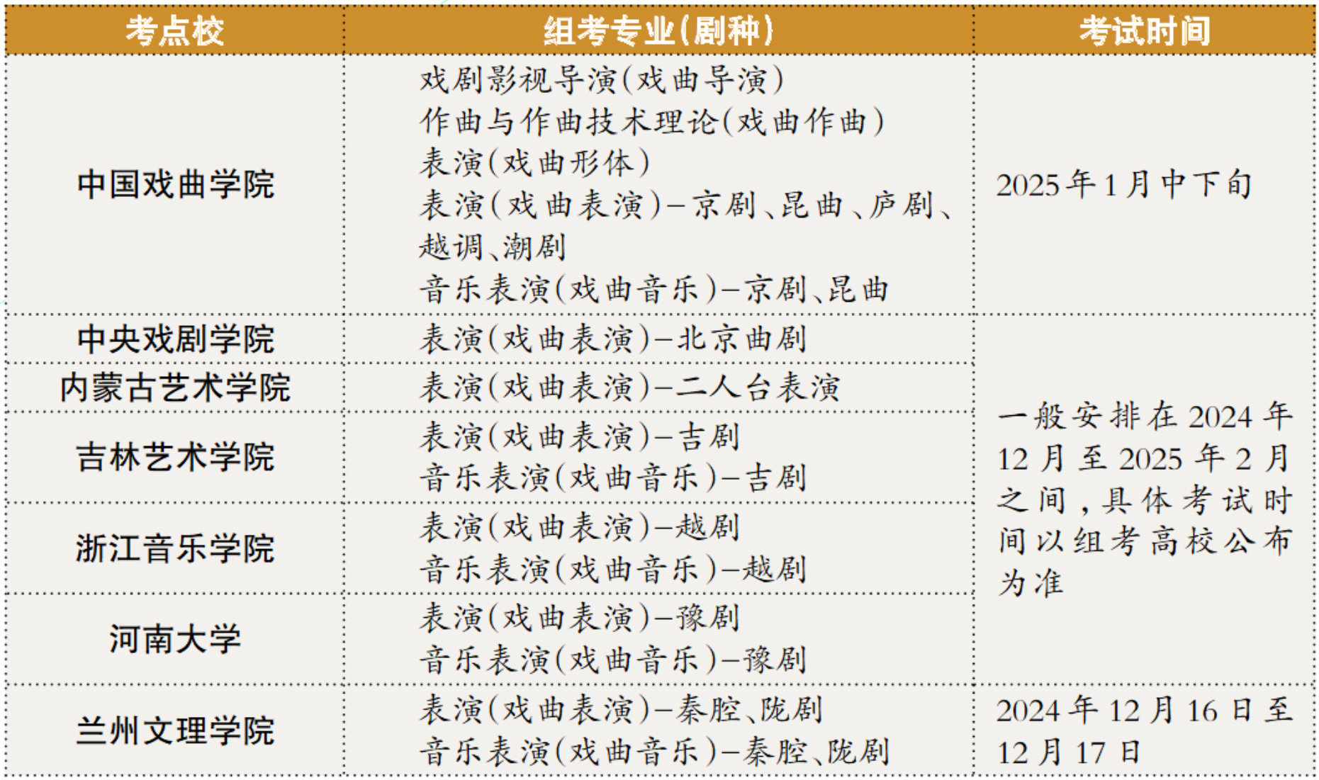戏曲类省际联考相关专业(剧种)考试考点及考试时间