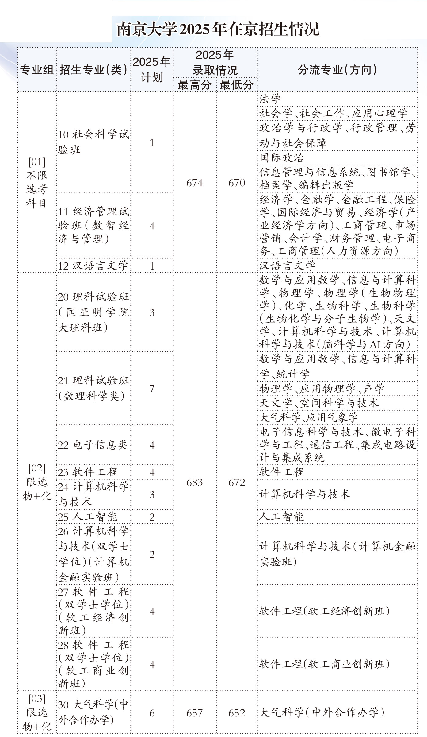 三是特色班型投放计划持续增加。南大积极回应北京考生和家长的需求,连续多年在北京投放理科试验班(匡亚明学院大理科班)招生计划。匡亚明学院是多学科综合点国家理科科学人才培养基地,先后入选教育部拔尖人才培养计划1.0和2.0基地,专注于物理、数学、化学、生物、信息等基础学科及其交叉学科研究型后备精英人才培养。同时,南大还设置了多个双学位班型,比如软工经济/商业创新班面向数智融合时代所需,培养一批技术与管理复合型跨界创新者。该双学位班型集成软件学院和商学院两大优势学科群,打造“以项目为载体”的课程体系,真正实现“学习强度1+1<2、能力加成1+1>2”的培养目标。这些特色班型2025年在京招生计划都有所增加。