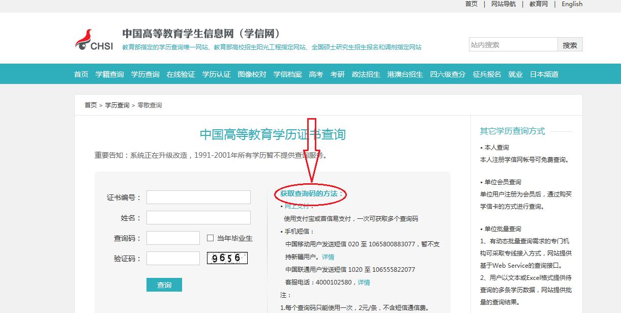 输入要查询的学历证书姓名、证书编号、查询码、校验码等即可查询,其中,查询码需考生发送短信获取,发送方式见网站“获取查询码的方法”说明: